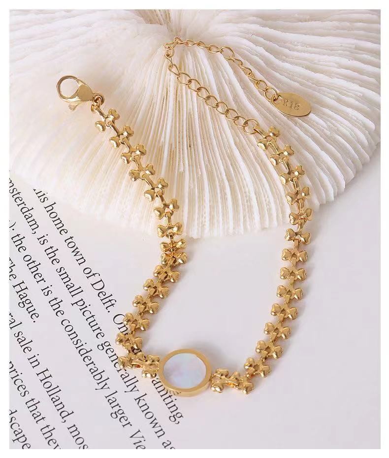 クラフト感のある個性的なチェーンx天然貝モチーフのブレスレット。