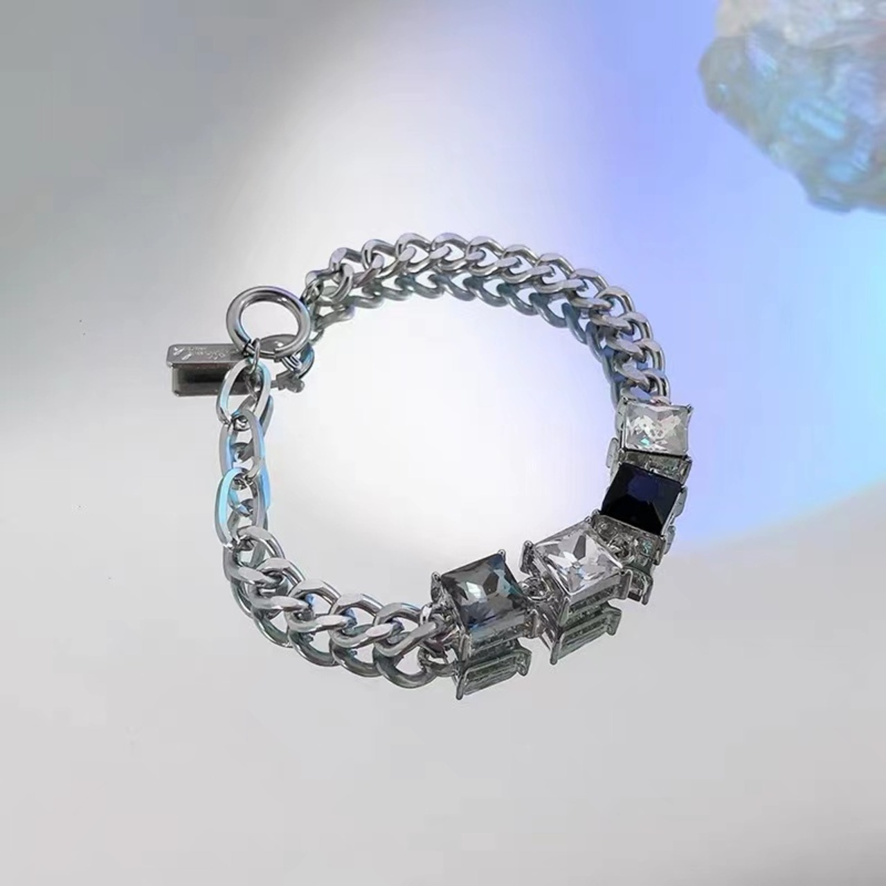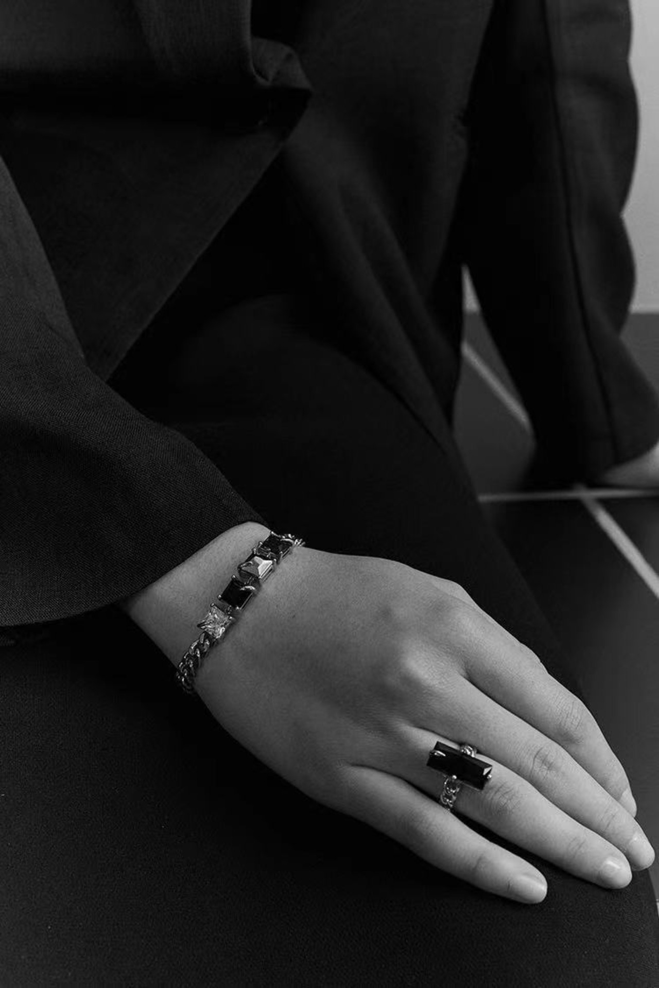 個性的な黒とクリアのキュービックジルコニア、太めチェーンこなれ感をプラスする。